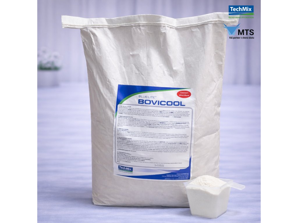 BlueLite® BoviCool Premix je zdrojem chutných a pufrovaných elektrolytů - především draslíku, sodíku a hořčíku. V kombinaci s více zdroji energie jako jsou dextróza, sacharóza a fruktóza poskytují krmné pelety zcela nezbytné živiny pro rehydrataci vyčerpaného organizmu během tepelného stresu. Následkem je stimulace příjmu vody a krmiva, opětovné zavodnění a kontrola rovnováhy tekutin. Zlepšení celkového zdravotního stavu se velice rychle projeví návratem plnohodnotné užitkovosti a lepší plodnosti, která během letních měsíců klesá. BoviCool je prostředkem, jak dát plemenicím to nejdůležitější pro překonání stresových podmínek ať při vysokém tepelném stresu či jiných stresových událostí (po otelení, přesuny, zákroky, onemocnění), které jsou vždy spojené s celkovým nedostatkem vody v organizmu. Osmolyt betain zprostředkovává transport živin, minerálů a vody mezi buňkou a mezibuněčným prostorem a udržuje buněčný objem.