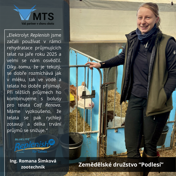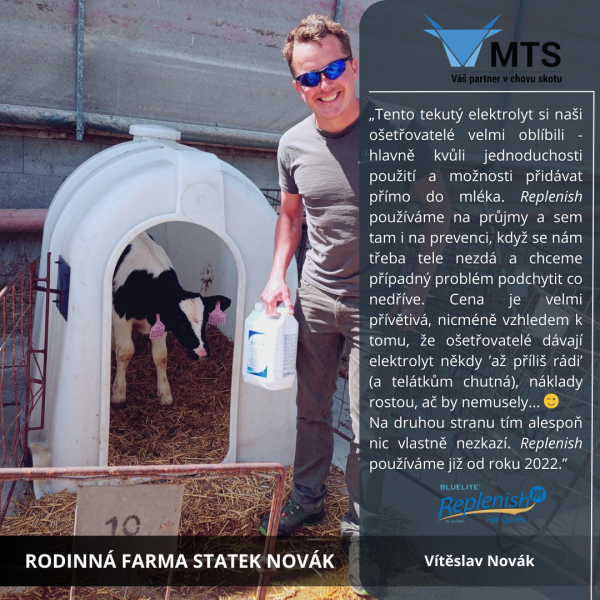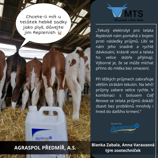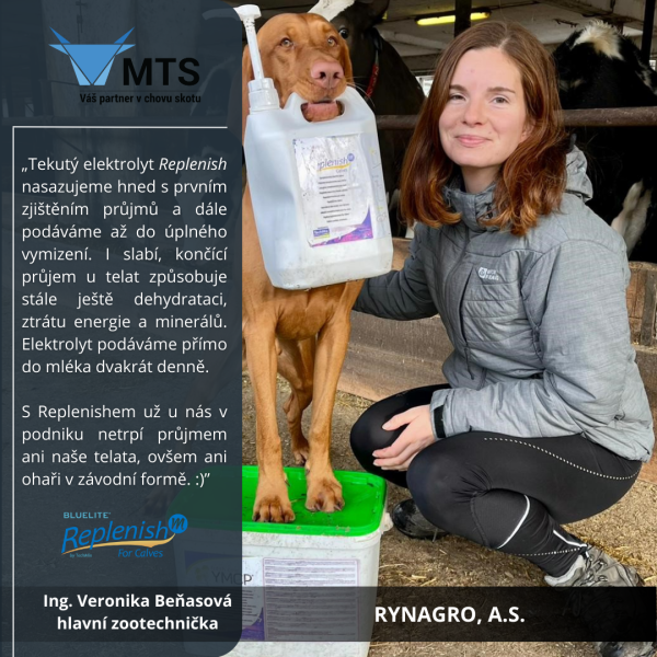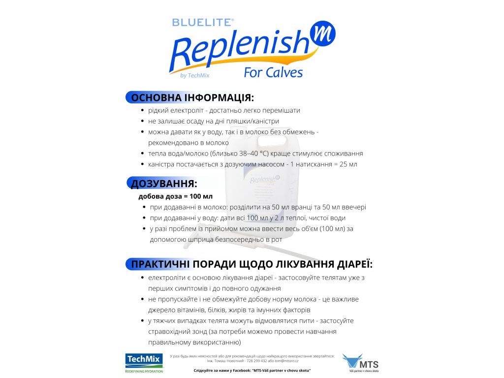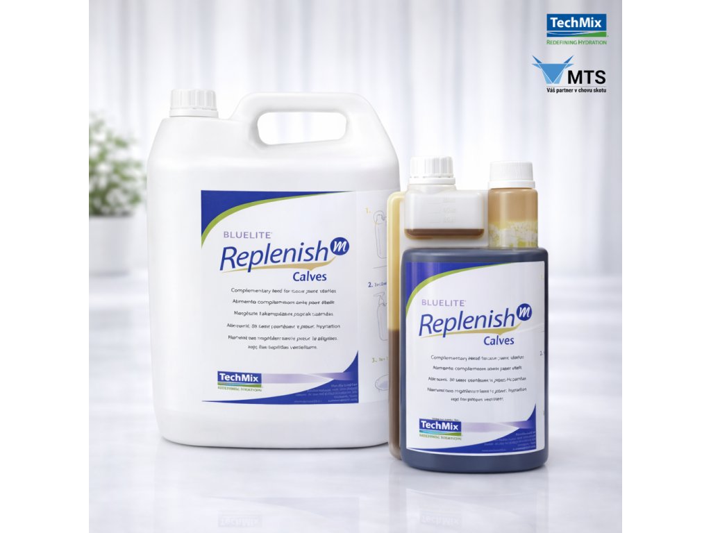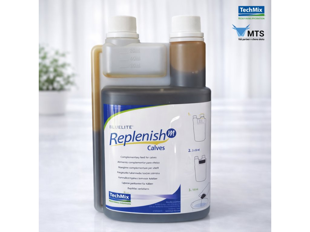 Replenishᴹ je vysoce kvalitní elektrolyt, jehož složení bylo postaveno na základě rozsáhlé, nekomerční studie tak, aby odpovídalo nejnovějším poznatkům o potřebách průjmových telat. Naprosto spolehlivě tak řeší dehydrataci, nedostatek energie a minerálů a především acidózu krve. Tekutá forma výrazně usnadňuje práci i čas ošetřovatelů při přípravě. Podání je možné do vody i mléka.