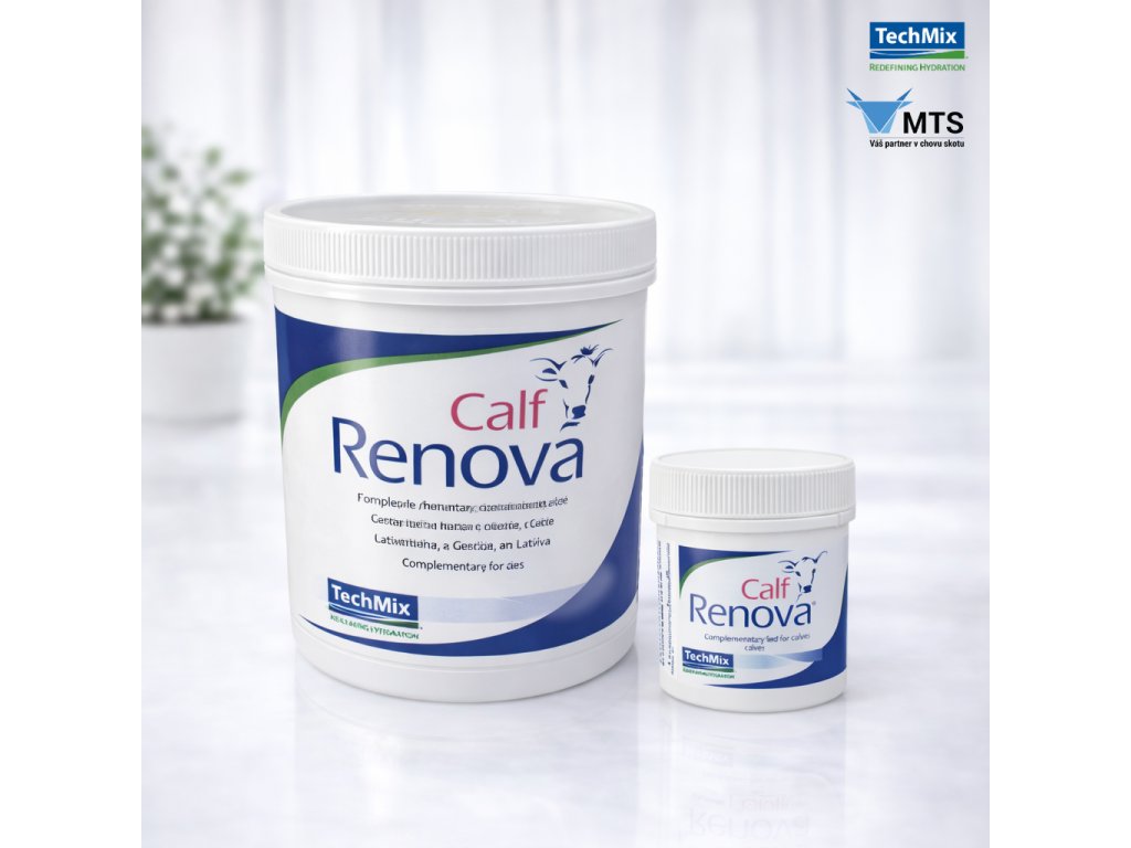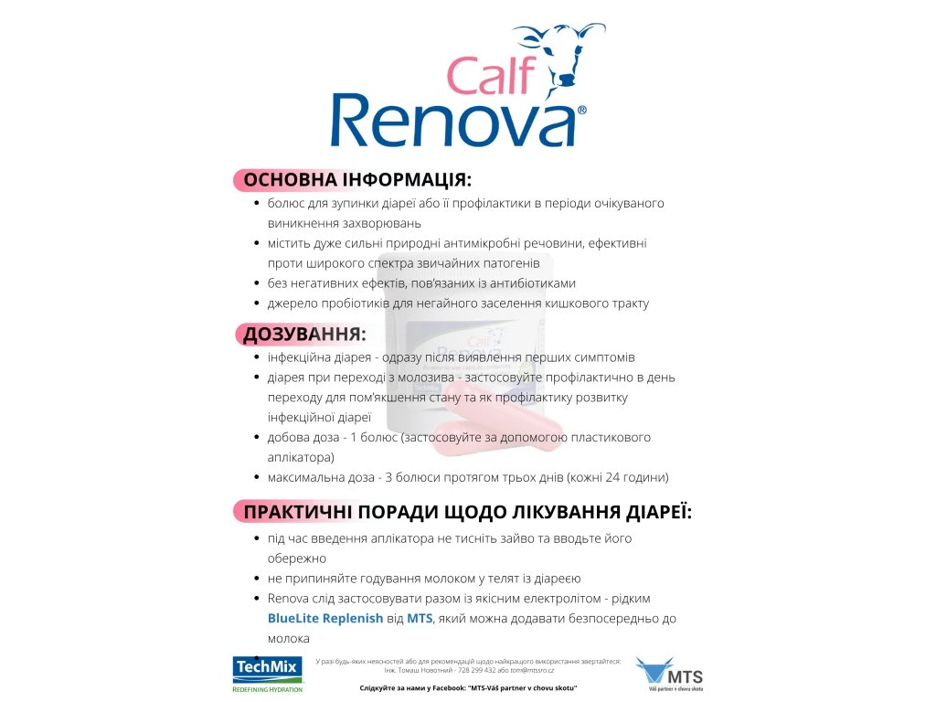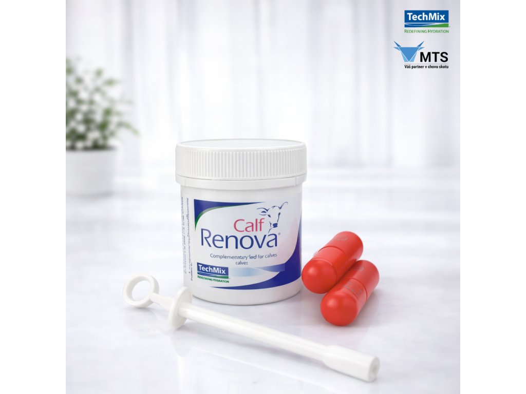Calf Renova® je prvním z produktů kompletního protokolu MTS pro průjmová telata. Úkolem je vyčistit trávicí trakt od škodlivých patogenů a současně podpořit zdravou mikroflóru pomocí obsažených probiotik. Vyřešení příčin onemocnění (=přemnožení patogenů), by mělo být zákonitě prvotním krokem v řešení průjmů. Na samotnou léčbu následků (dehydratace, acidóza, nedostatek energie a minerálů) je už nutné navázat kvalitním elektrolytem - z nabídky MTS buď šumivé tablety HydraTabs® či tekutý Replenishᴹ.
