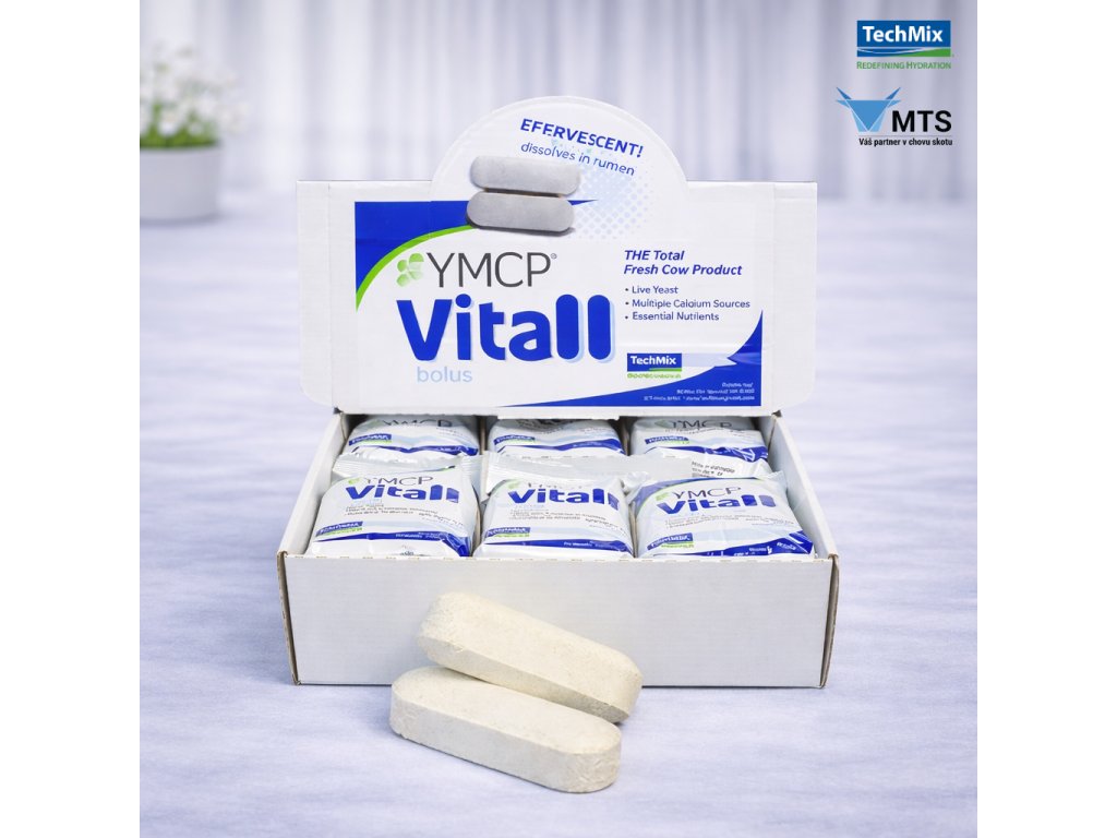 Vitall® je unikátní bolus na trhu, jelikož jako jediný obsahuje živé kvasinky. Oproti ostatním bolusům či 500 ml nápojům tak navíc zajišťuje ještě okamžité nastartování bachorového trávení, které je klíčem k prevenci metabolických onemocnění způsobených drastickým nedostatkem energie okamžitě po otelení. Zdroj živých kvasinek, hořčíku, vápníku, draslíku, niacinu a dalších esenciálních živin potřebných k usnadnění bezproblémového poporodního období a co nejlepšího přechodu do vysoké laktace. Okamžitě dostupný vápník pomáhá dojnicím vyrovnat se s riziky hypokalcémie. Vysokoužitkové dojnice vyžadují okamžitě po otelení ale mnohem více, než pouze energii a vápník, na kterých je postavena naprostá většina jiných bolusů či nápojů. Vitall® je nejlepší volbou pro ty, kteří se spokojí pouze s tím nejlepším. Produkt je také nabízen ve formě velkoobjemového nápoje/drenče Fresh Cow YMCP®.